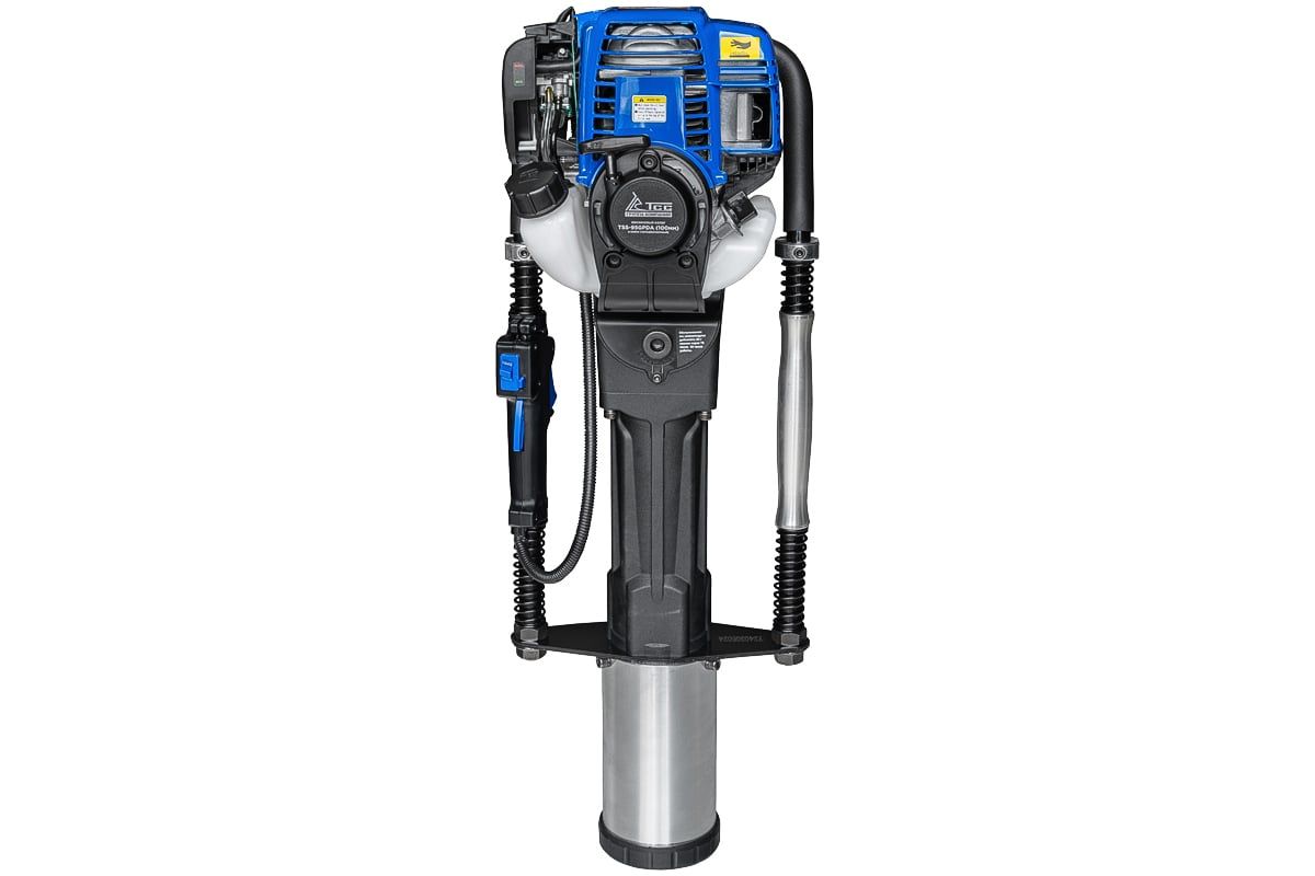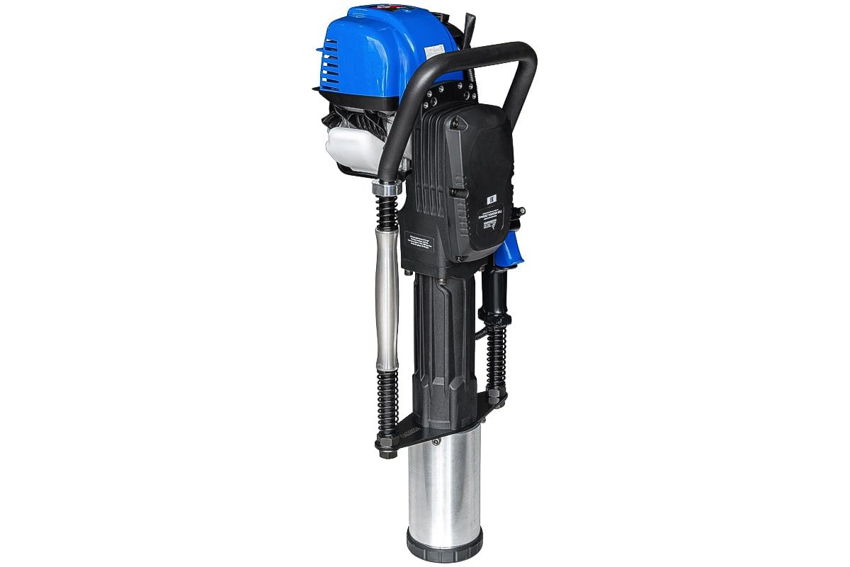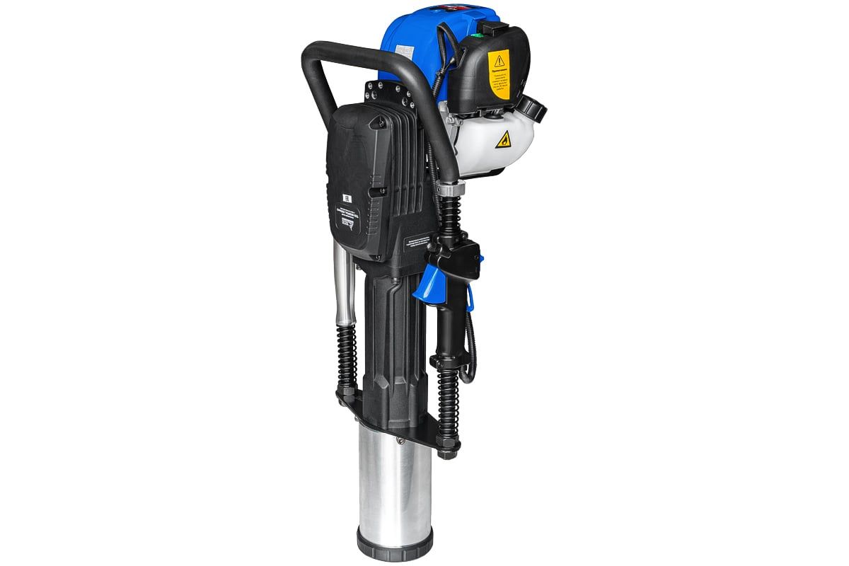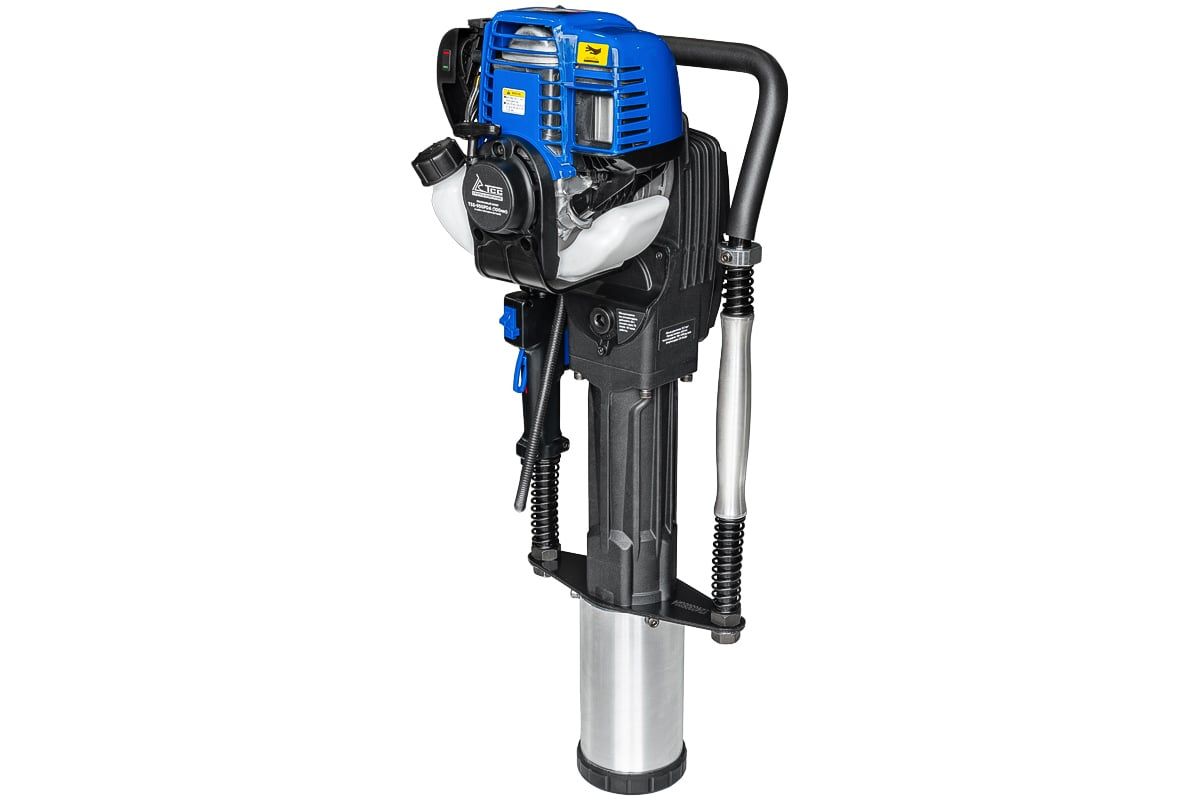 Копер с бензиновым четырехтактным двигателем для забивки столбов диаметорм до 100 мм. Мощность двигателя инструмента — 1,36 кВт. Главным образом этот инструмент используется при строительстве ограждений. В отличии от электрического, он более мощный и не требует источника электропитания. По сравнению с пневматическими или гидравлическими, использование бензинового копера не требует дополнительной спецтехники, Значительно ниже по стоимости.