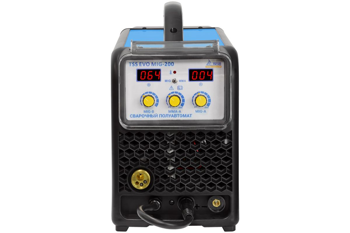 ТSS EVO MIG-200 - сварочный полуавтомат инверторный. Компактный, легкий, удобный для переноски, а также при транспортировке, хранении. Корпус из листовой стали, надежно защищает внутренние элементы от повреждения. Предназначен для полуавтоматической сварки в среде защитных газов (MIG/MAG), а также ручной дуговой сварки покрытым электродом (ММА). Аппарат имеет защиту от перегрузки, индикатор перегрева и неисправности, обеспечивая высокий уровень безопасности и надежность устройства. Так же данный аппарат имеет защиту от скачков напряжения. Высокое напряжение холостого хода обеспечивает легкость поджига сварочной дуги. Высокая стабильность сварки в реальном времени, простое интуитивно понятное управление сварочными параметрами.